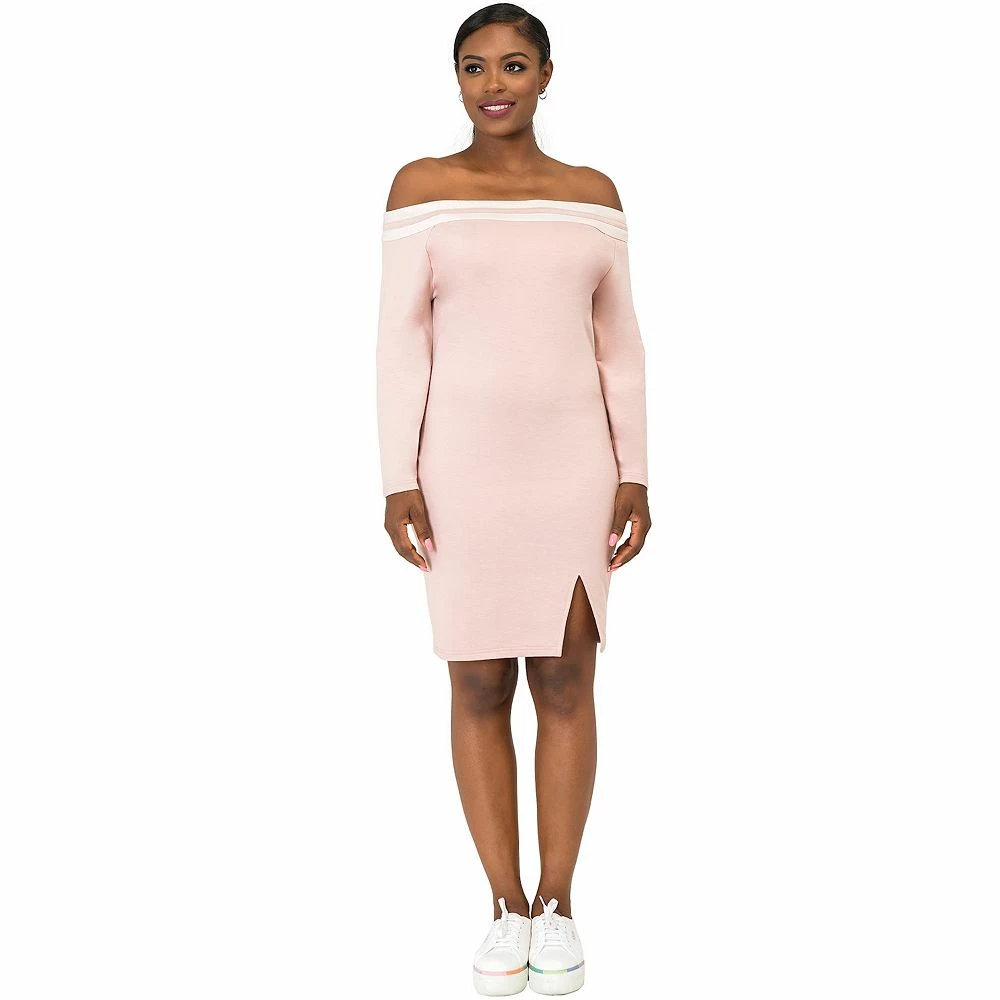 This dusty mauve off-the-shoulder mini dress features a front split & athletic stripe neckline. The baby french terry athleisure dress features raglan sleeves for a more glamorous, lounging look.